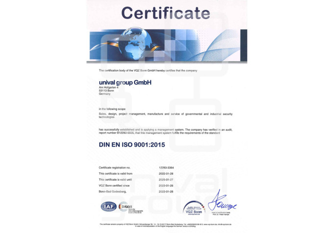 unival group operates under a verified quality management system aligned with recognized ISO standards. Regular external audits confirm consistent and controlled processes across development, production, installation, and long-term support.